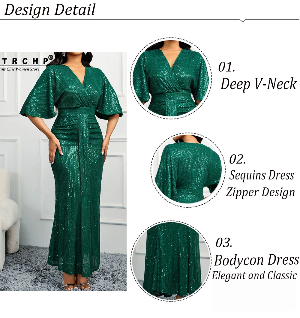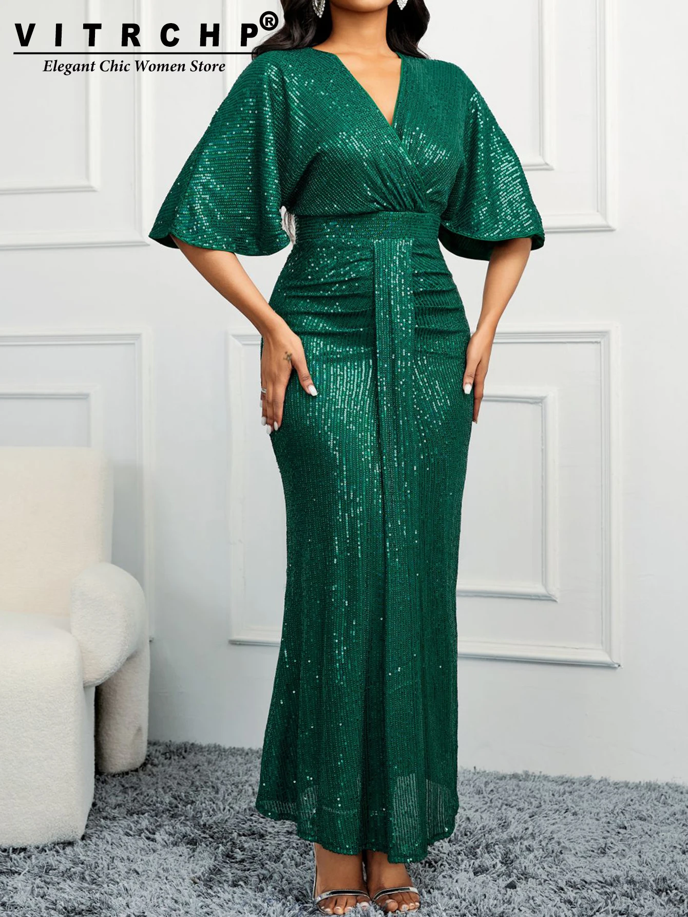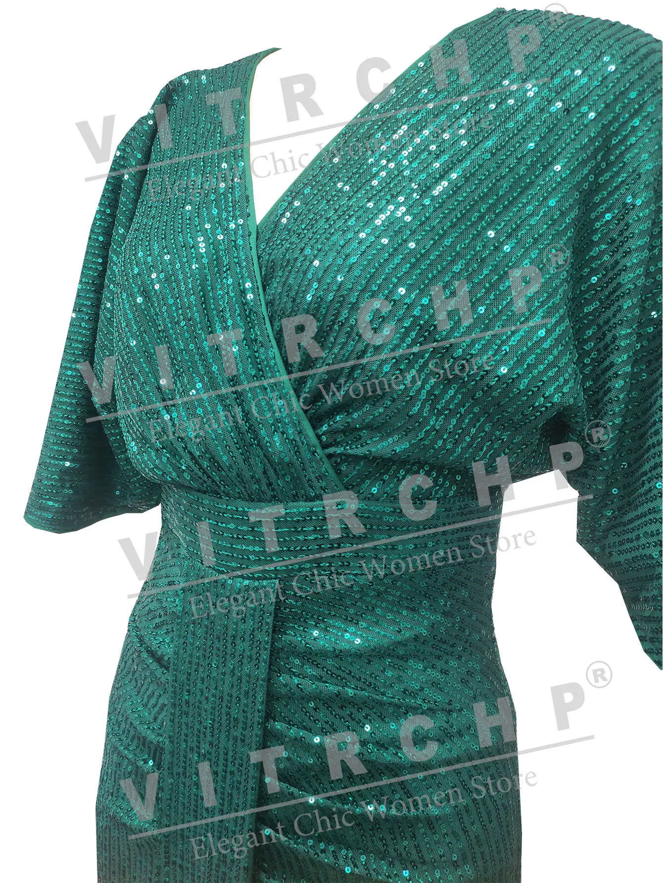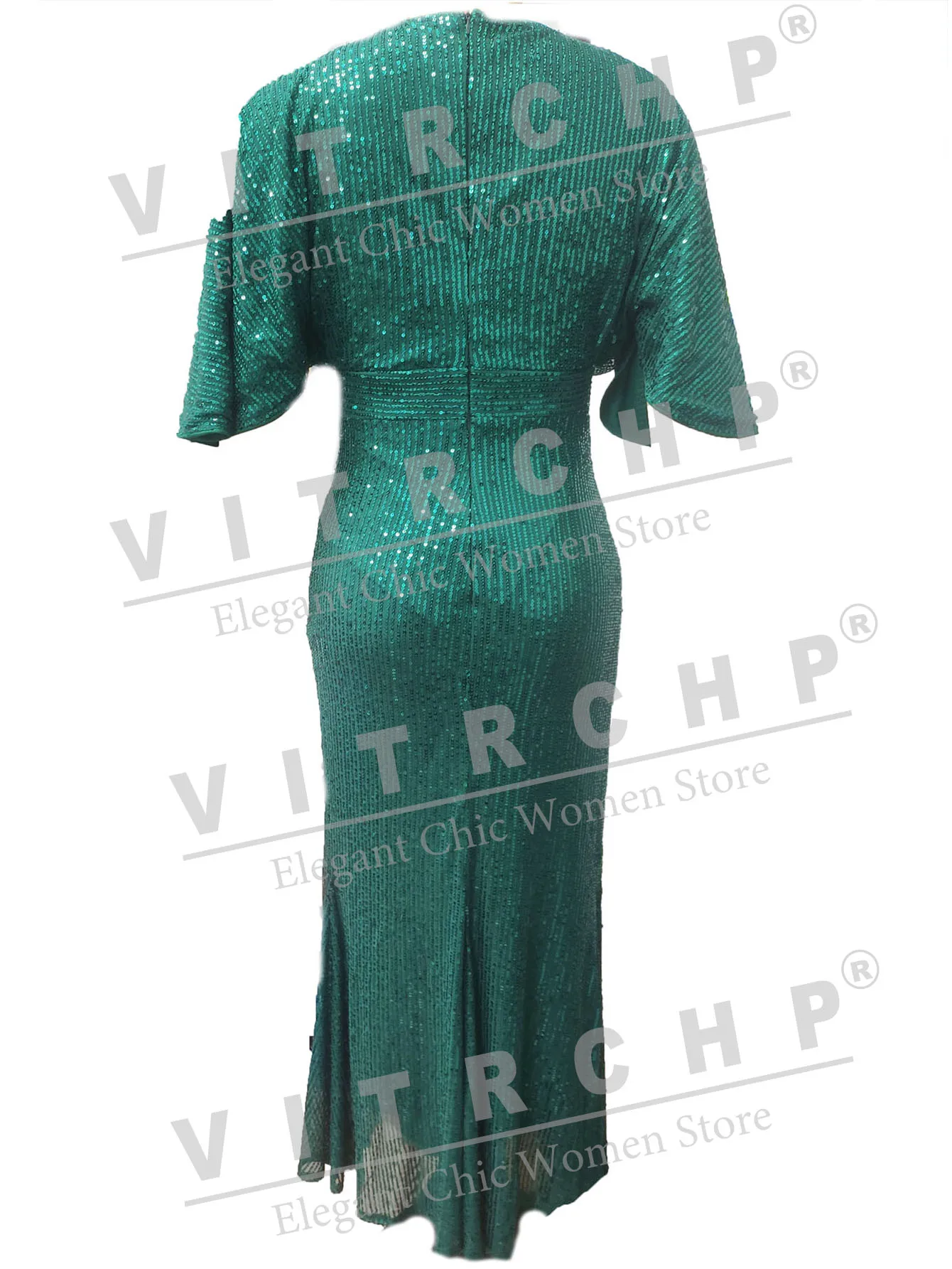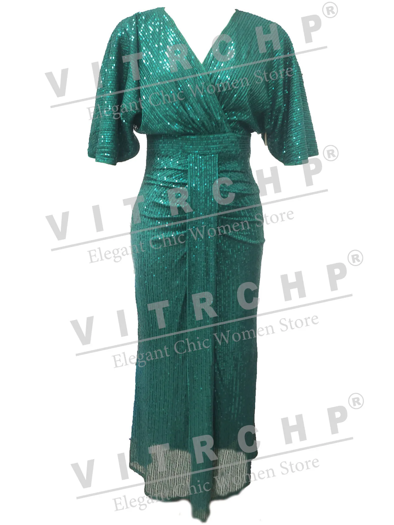 2025 Women High Waistedey Sexy V-neck Sequin Dress Fashion Raglan Sleeves Slim Long Skirt Banquet Cocktail Party Formal Dresses
