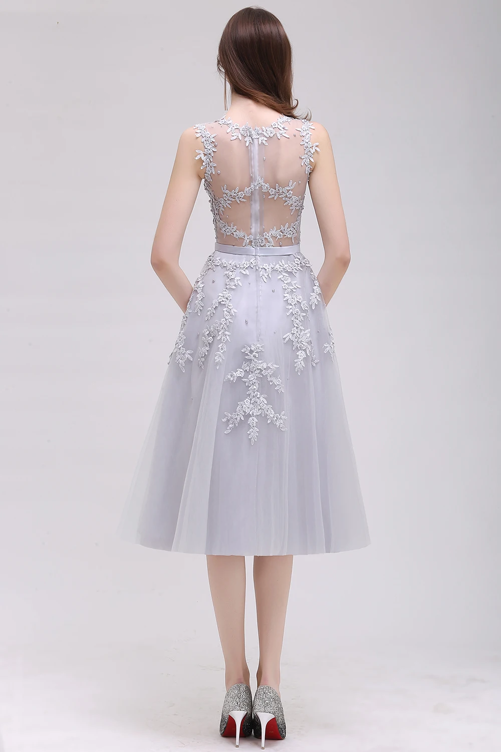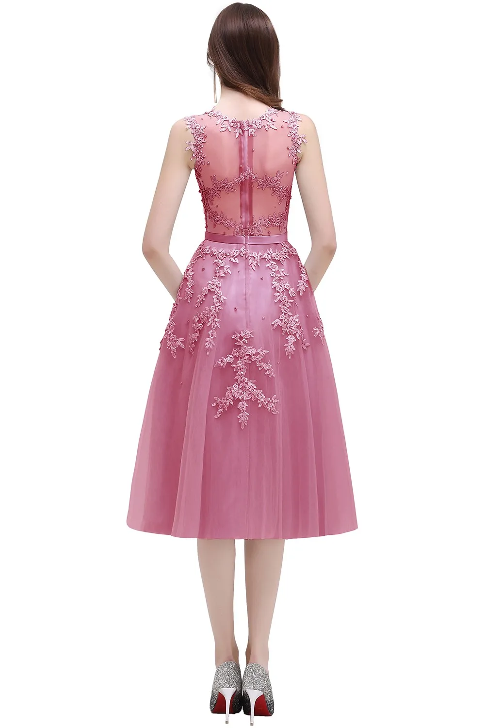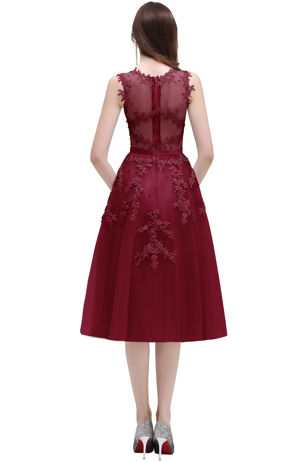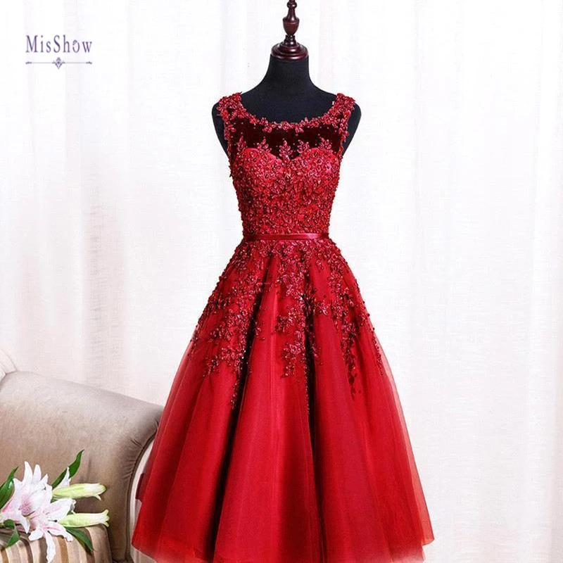 Burgundy Soft Tulle Wedding Dress Ankle-length Applique Scoop Neckline Sleeveless Prom Dresses Zipper Up Wedding Party Dress