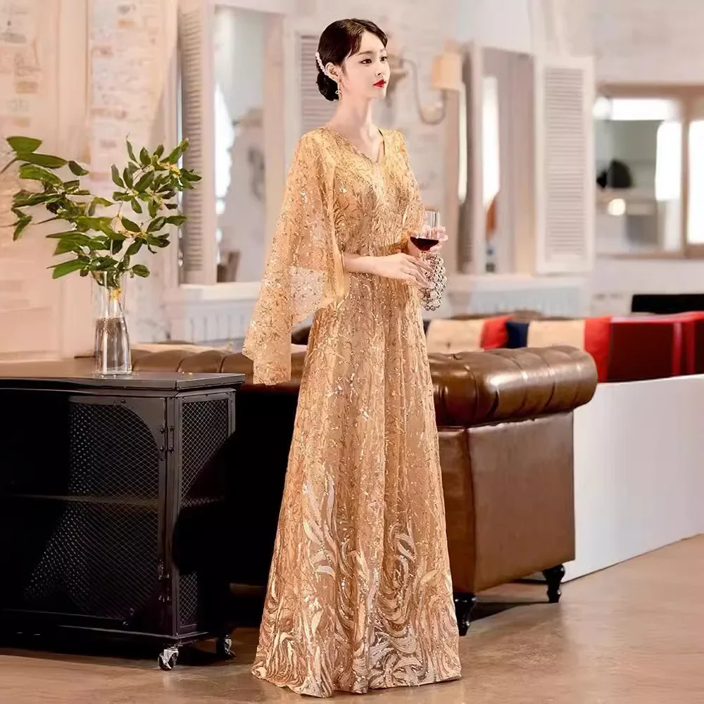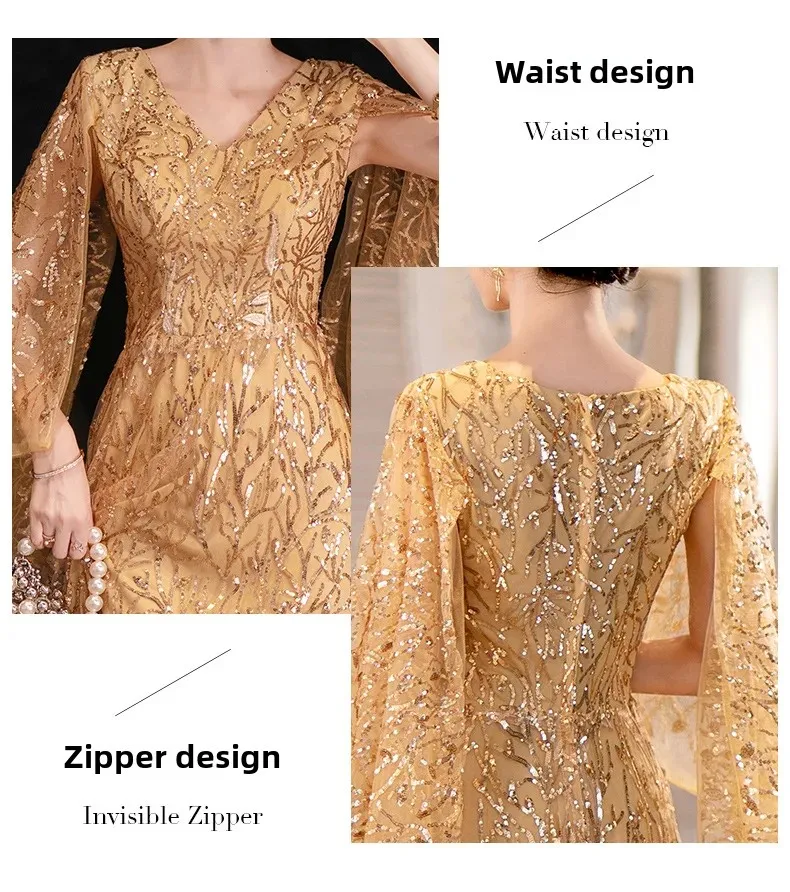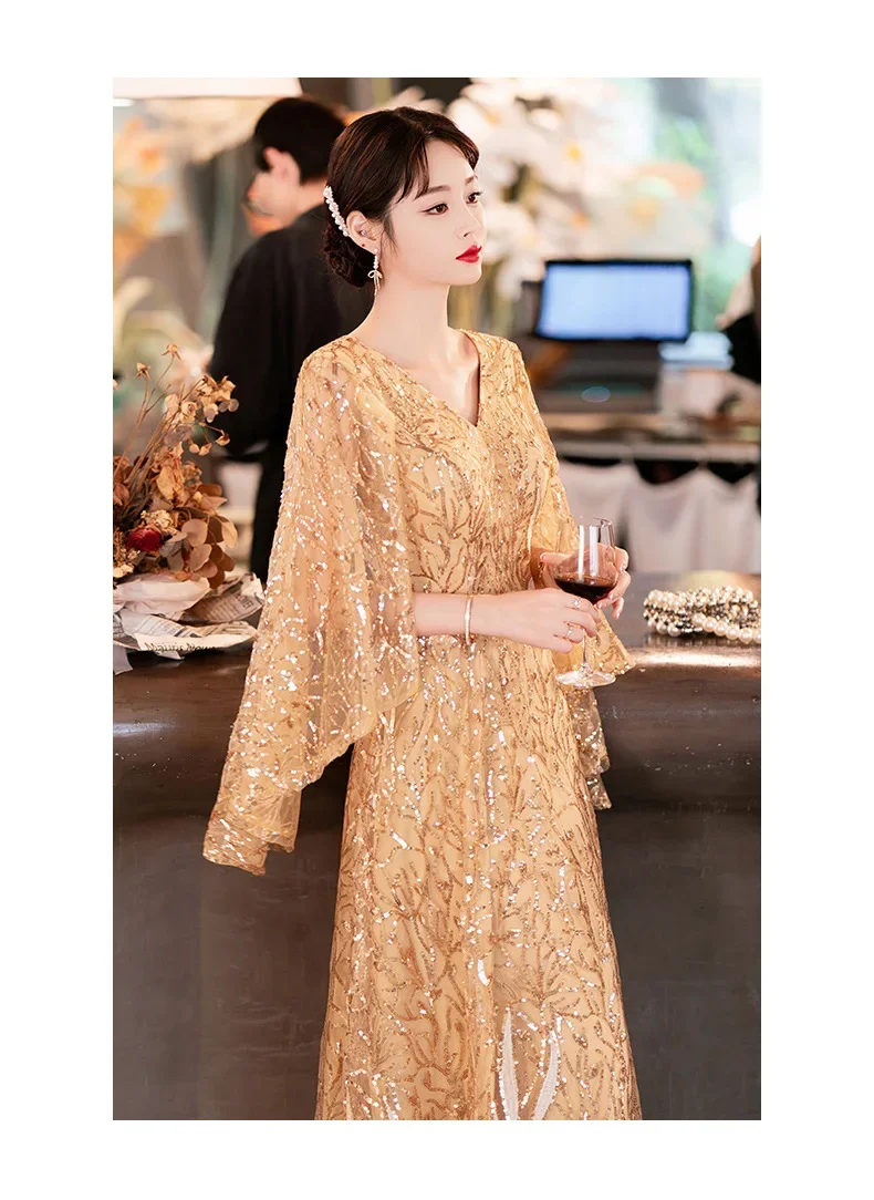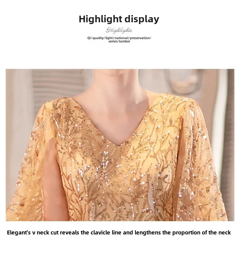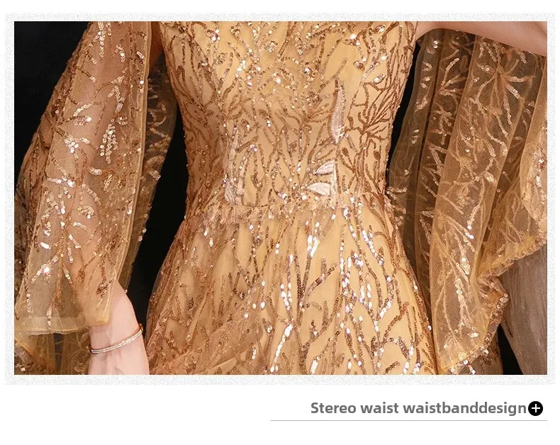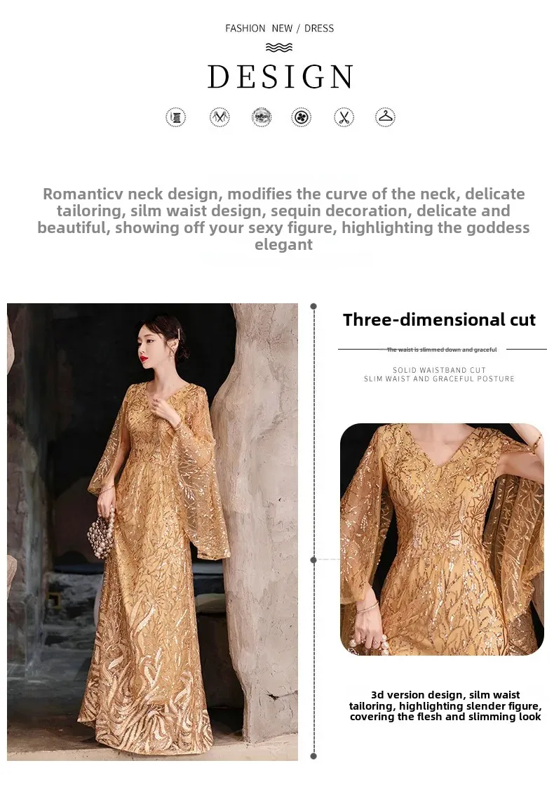Elegant High-End Feel Gold Evening Dress For Women Light Luxury Hostess Dress Art Exam Commander Performance Outfit Sequins Long