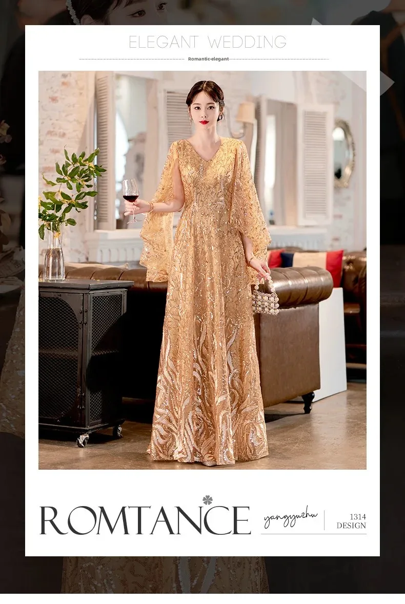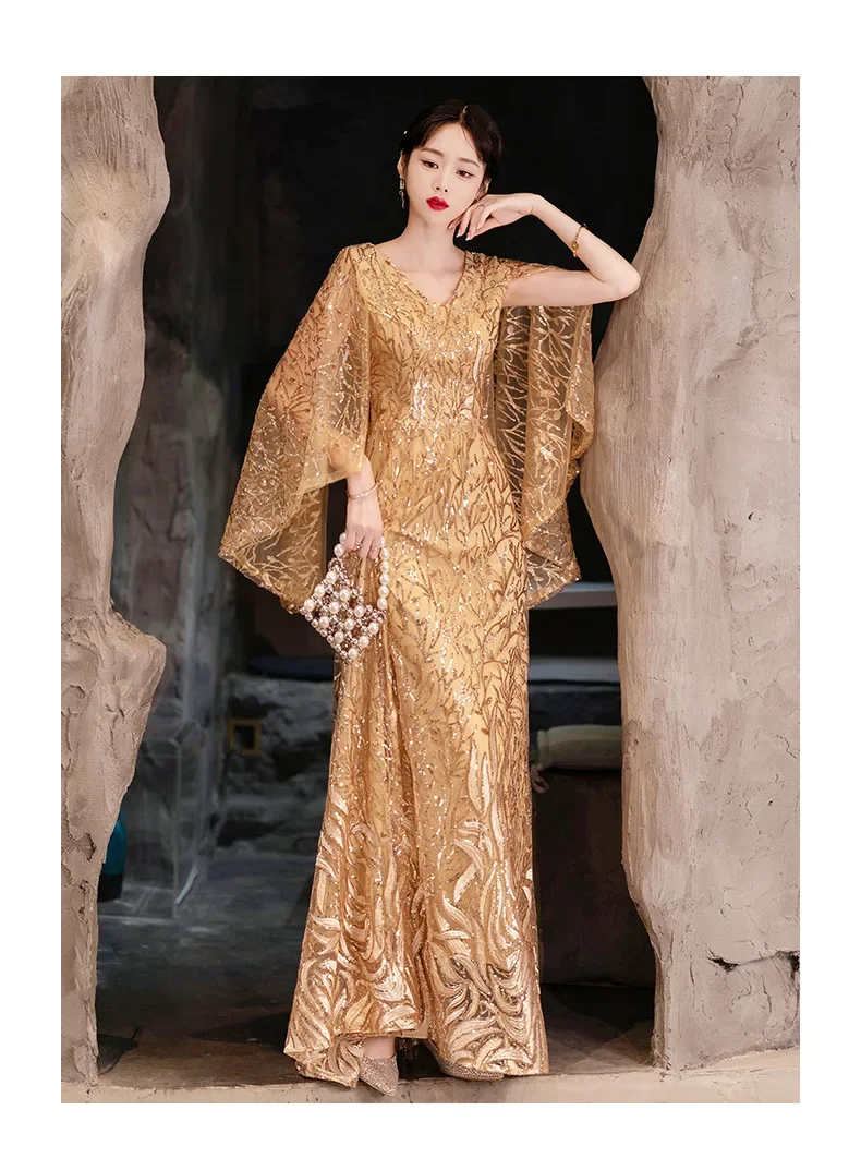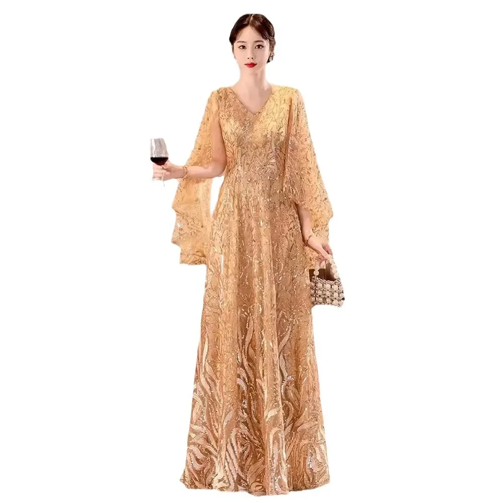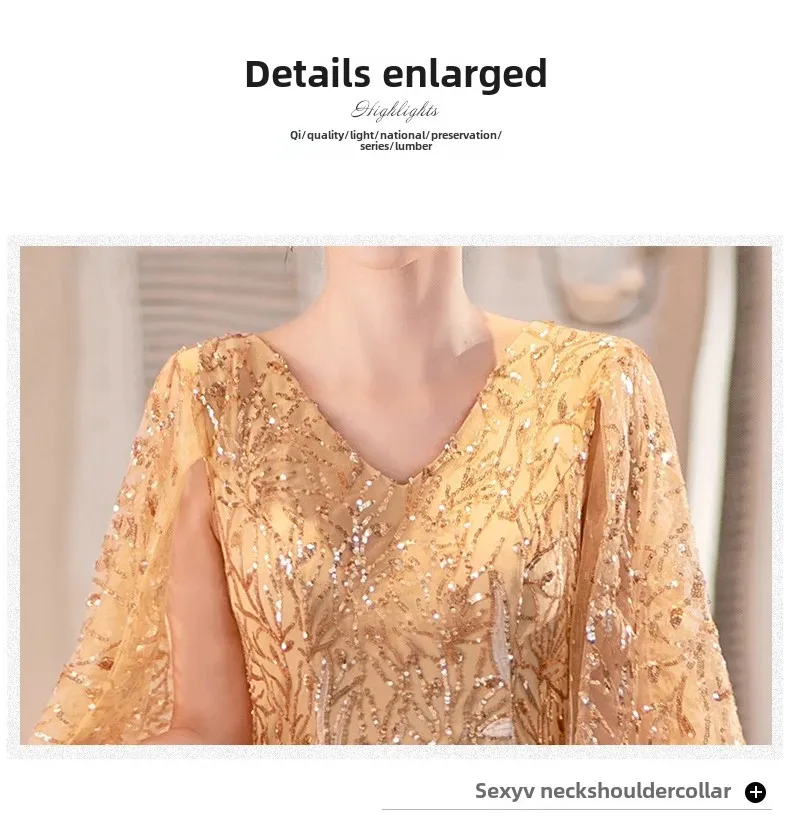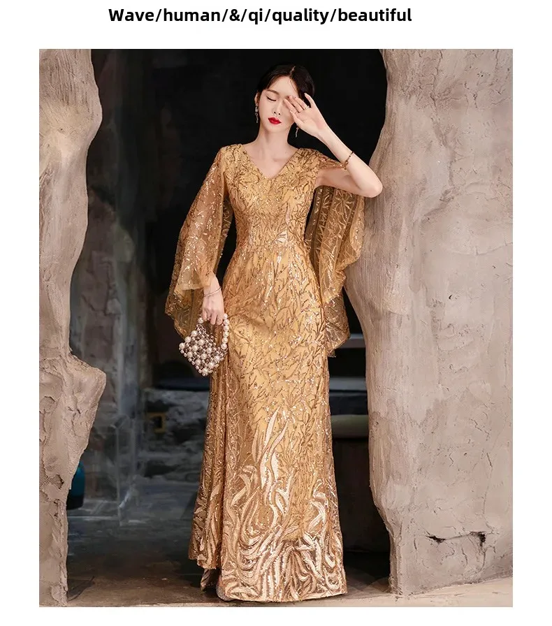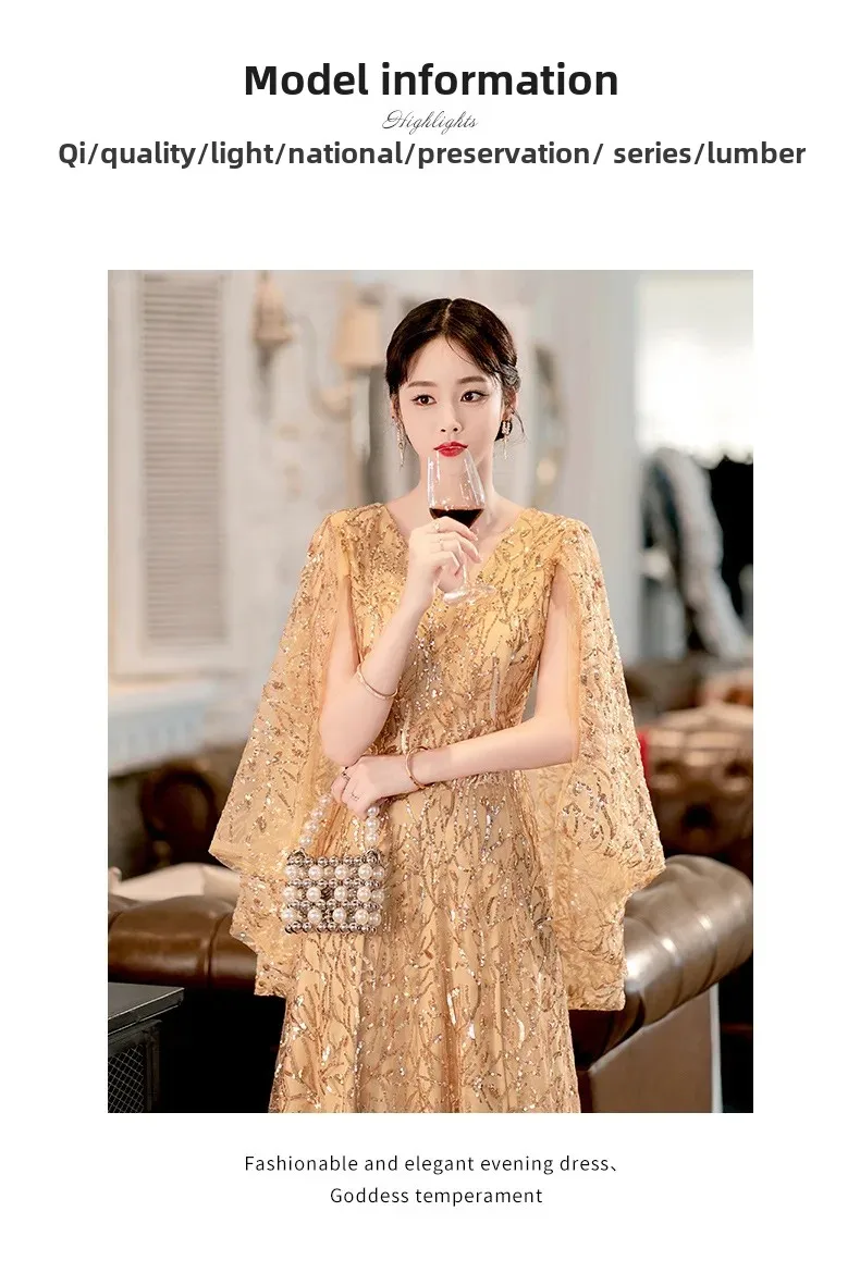 Elegant High-End Feel Gold Evening Dress For Women Light Luxury Hostess Dress Art Exam Commander Performance Outfit Sequins Long