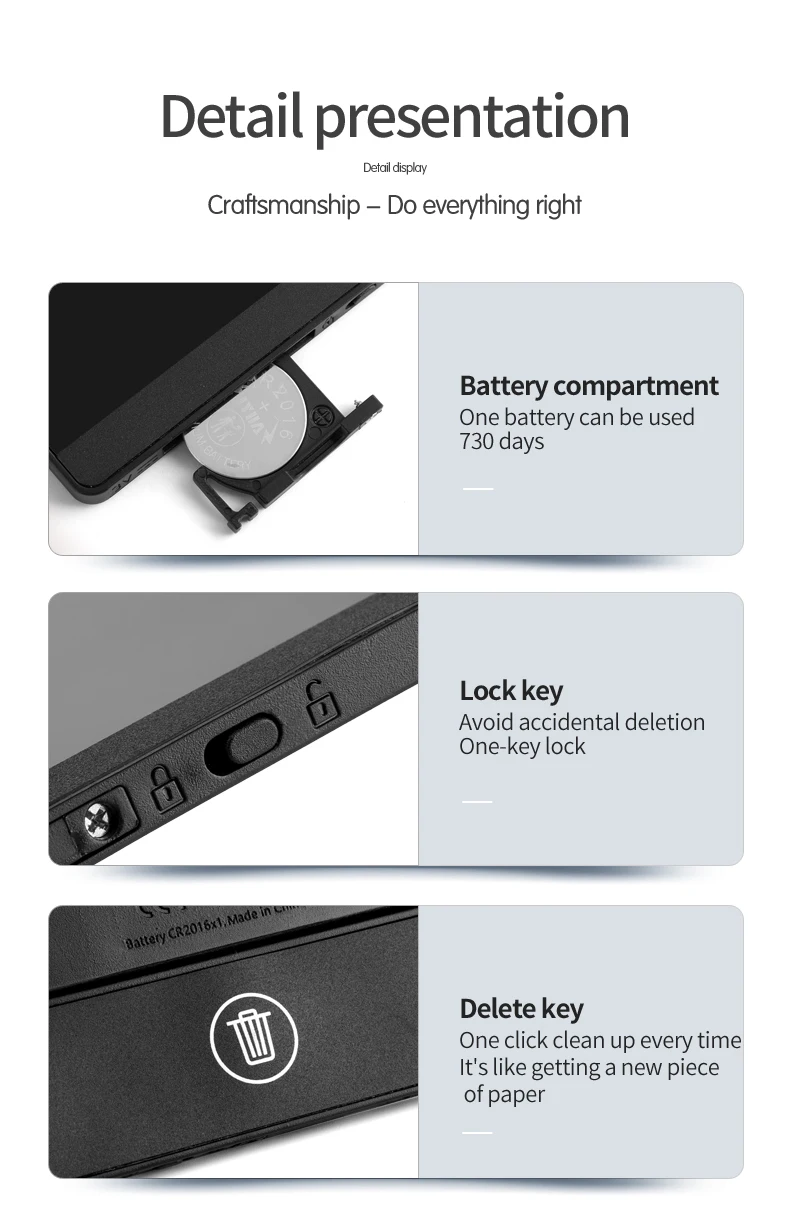 1. When the writing pad is left for a long time or not used for a long time, the delete button may not be deleted. Please remove the battery, rub it with your fingers, or clamp the positive and negative poles of the battery with a metal object for 3-5 seconds , You can reactivate the battery, do not reverse the front and back of the battery, reinstall it into the writing board and delete it normally;