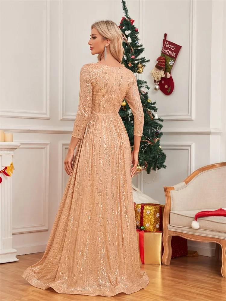 Lucyinlove Luxury V Neck Long Sleeves Blue Sequins Formal Evening Dress Women Wedding Party Prom Maxi Cocktail Dress Gowns