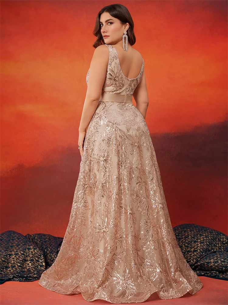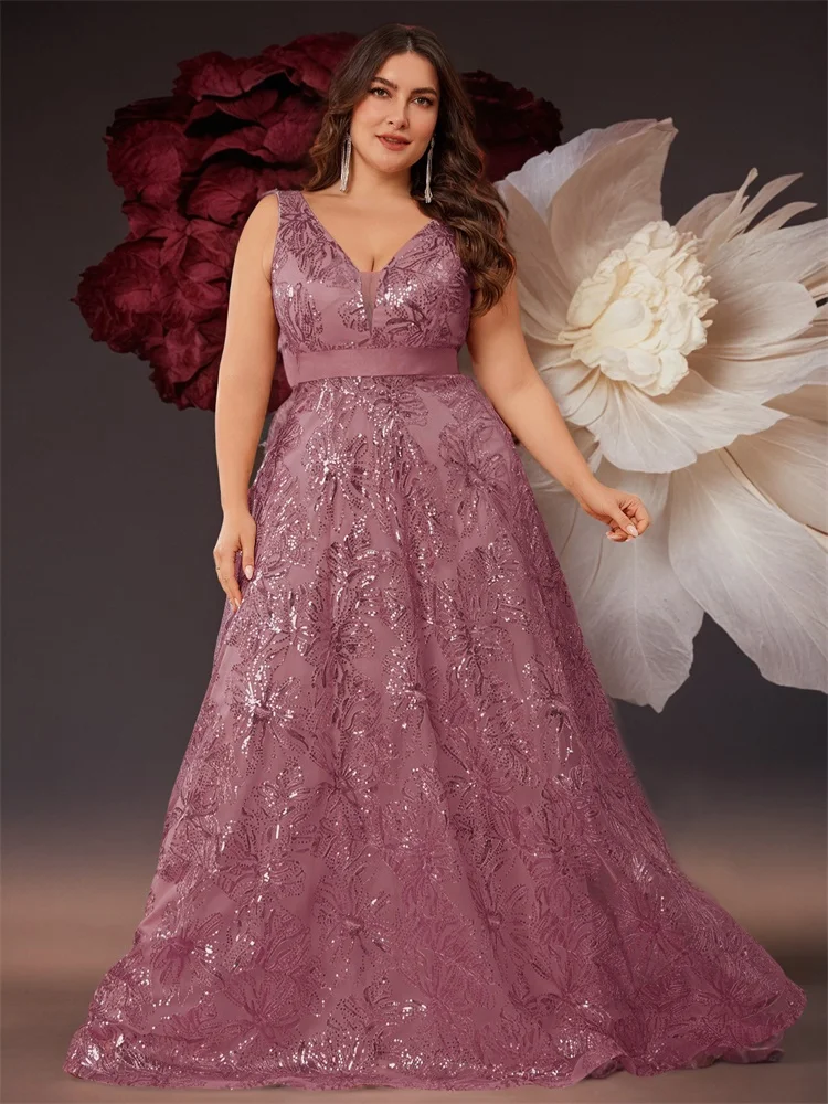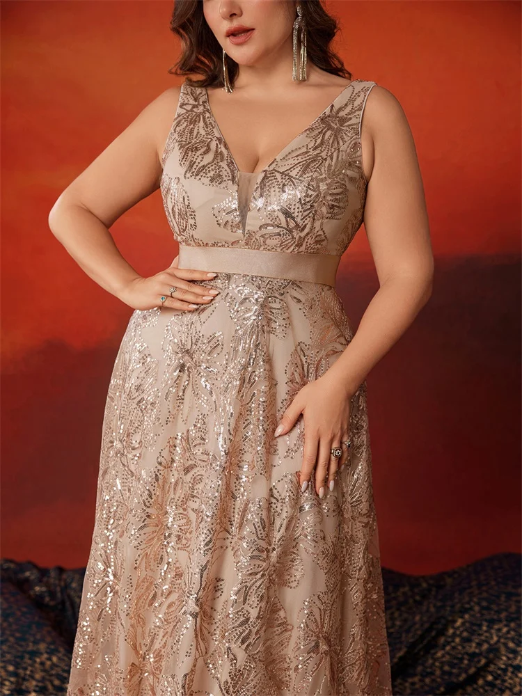 Lucyinlove Plus Size Luxury Deep V-Neck Sequins Blue Evening Dress Women Elegant V-back Wedding Party Long Prom Cocktail Dresses