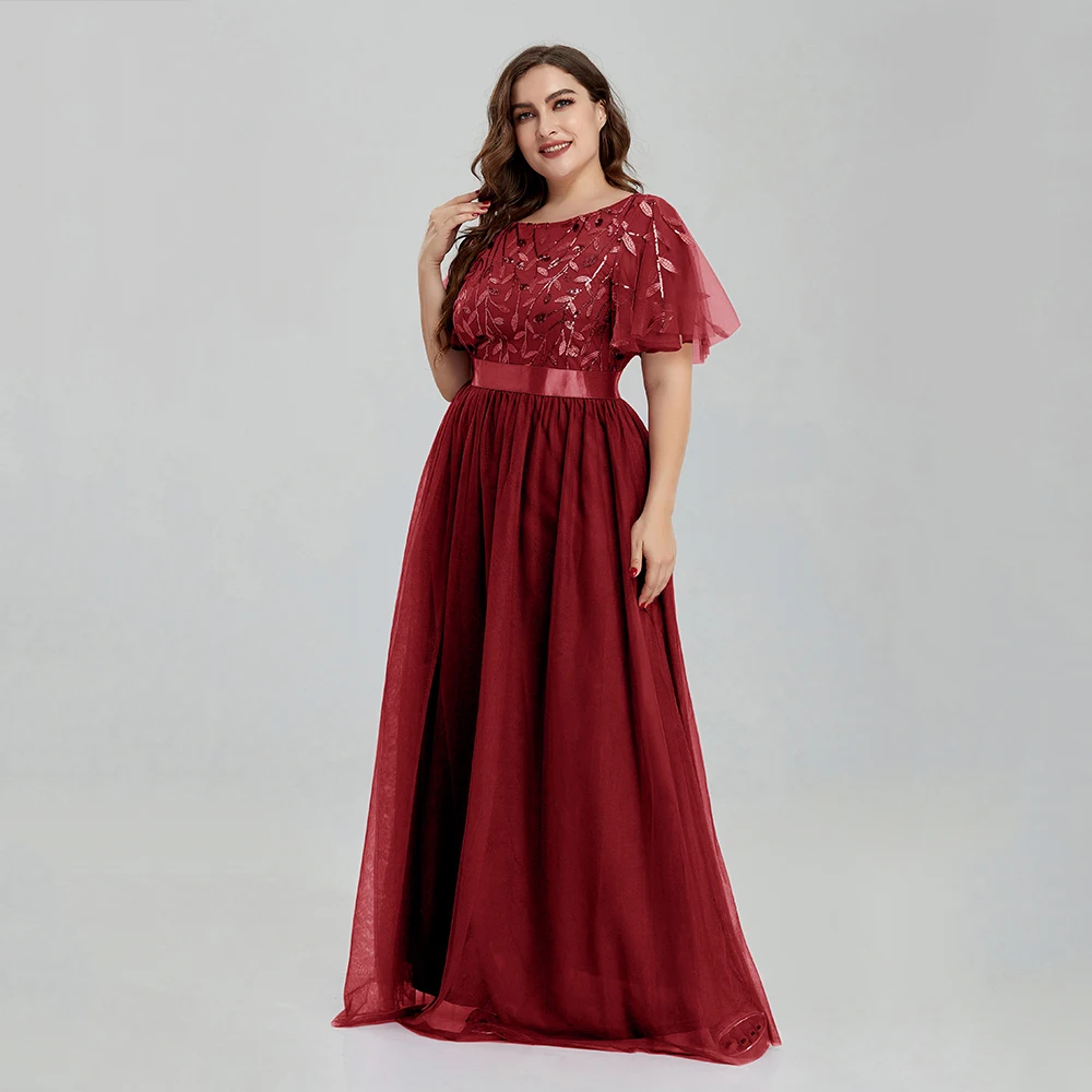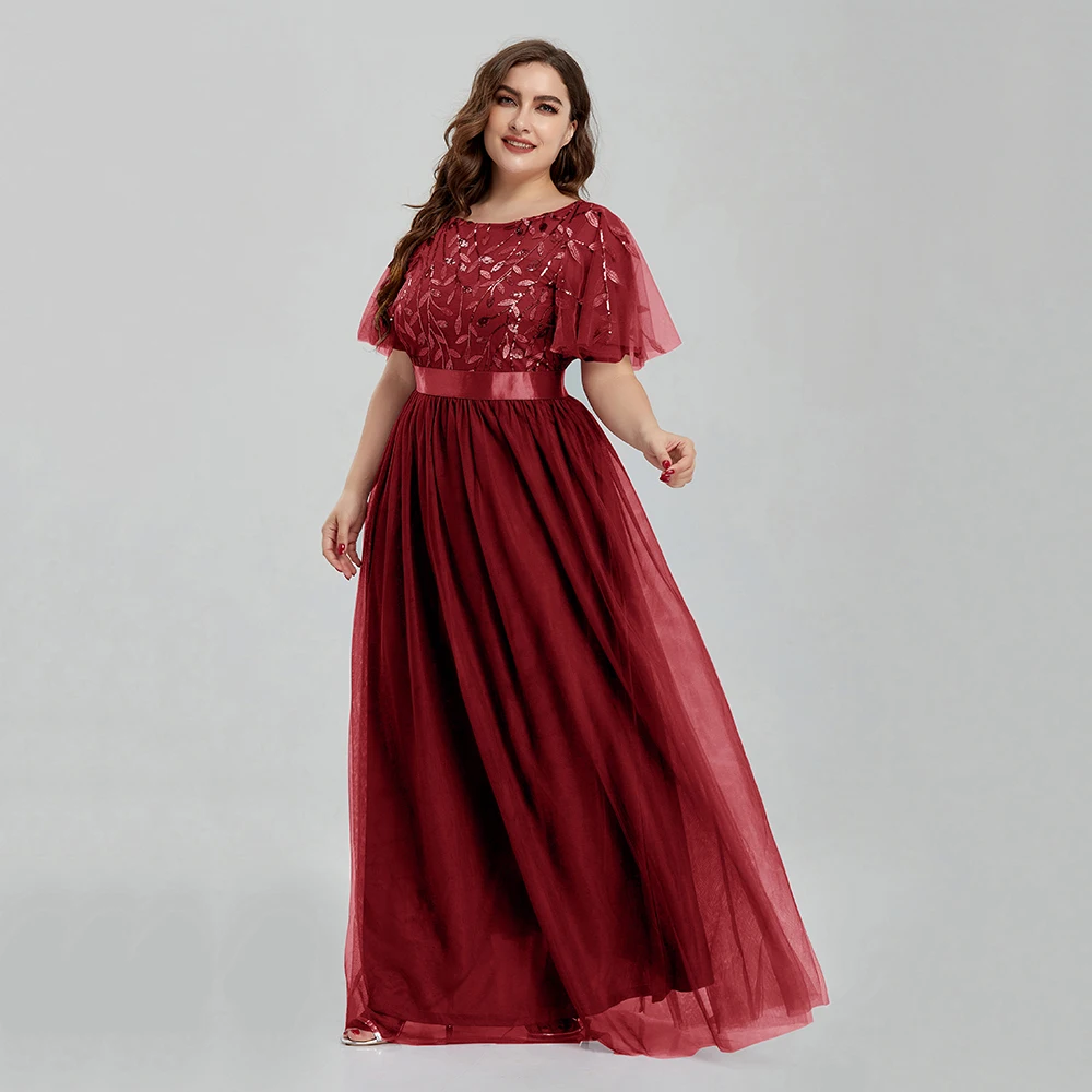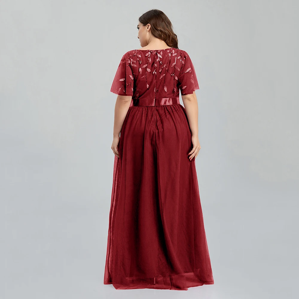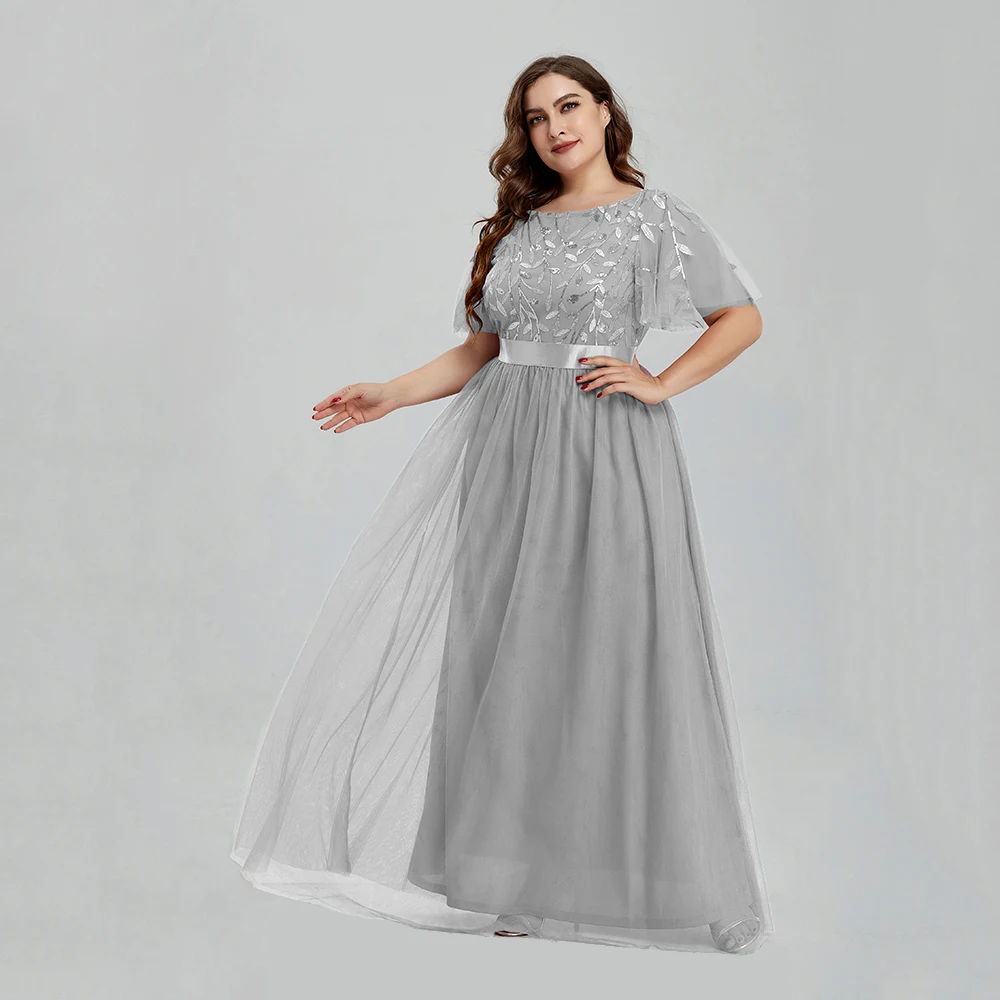 Women’s Plus Size Mesh A-Line Sequin Embroidery Evening Dress Leaf Maxi Prom Dress With Sleeves For Wedding Dress 2022