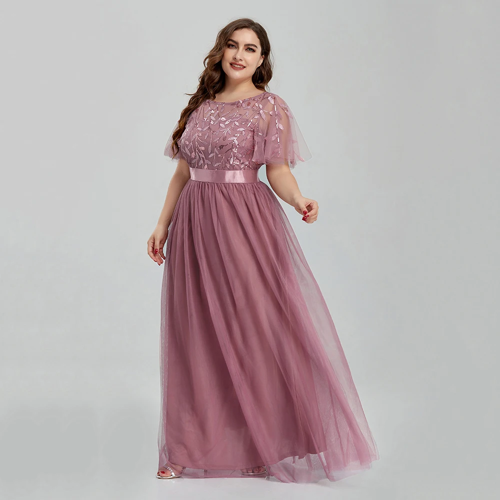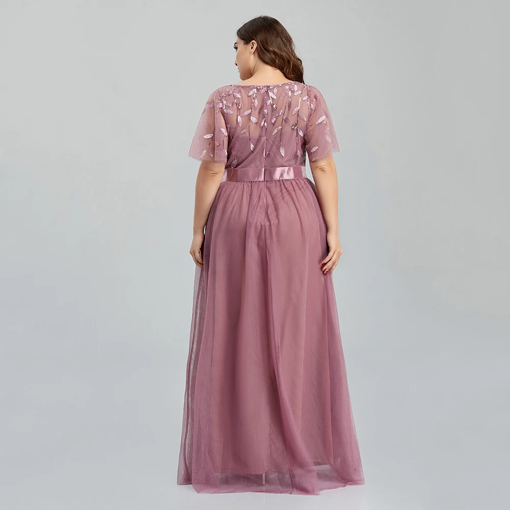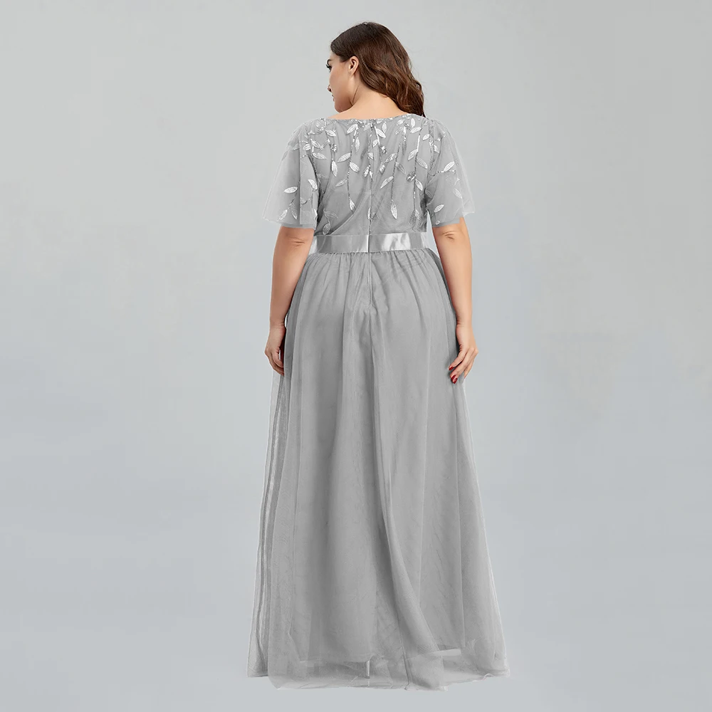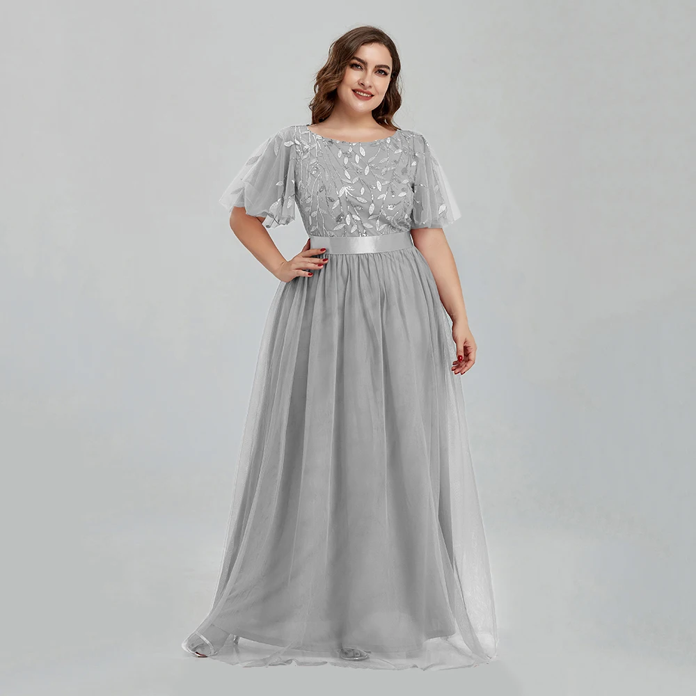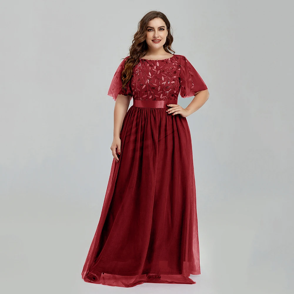 Women’s Plus Size Mesh A-Line Sequin Embroidery Evening Dress Leaf Maxi Prom Dress With Sleeves For Wedding Dress 2022