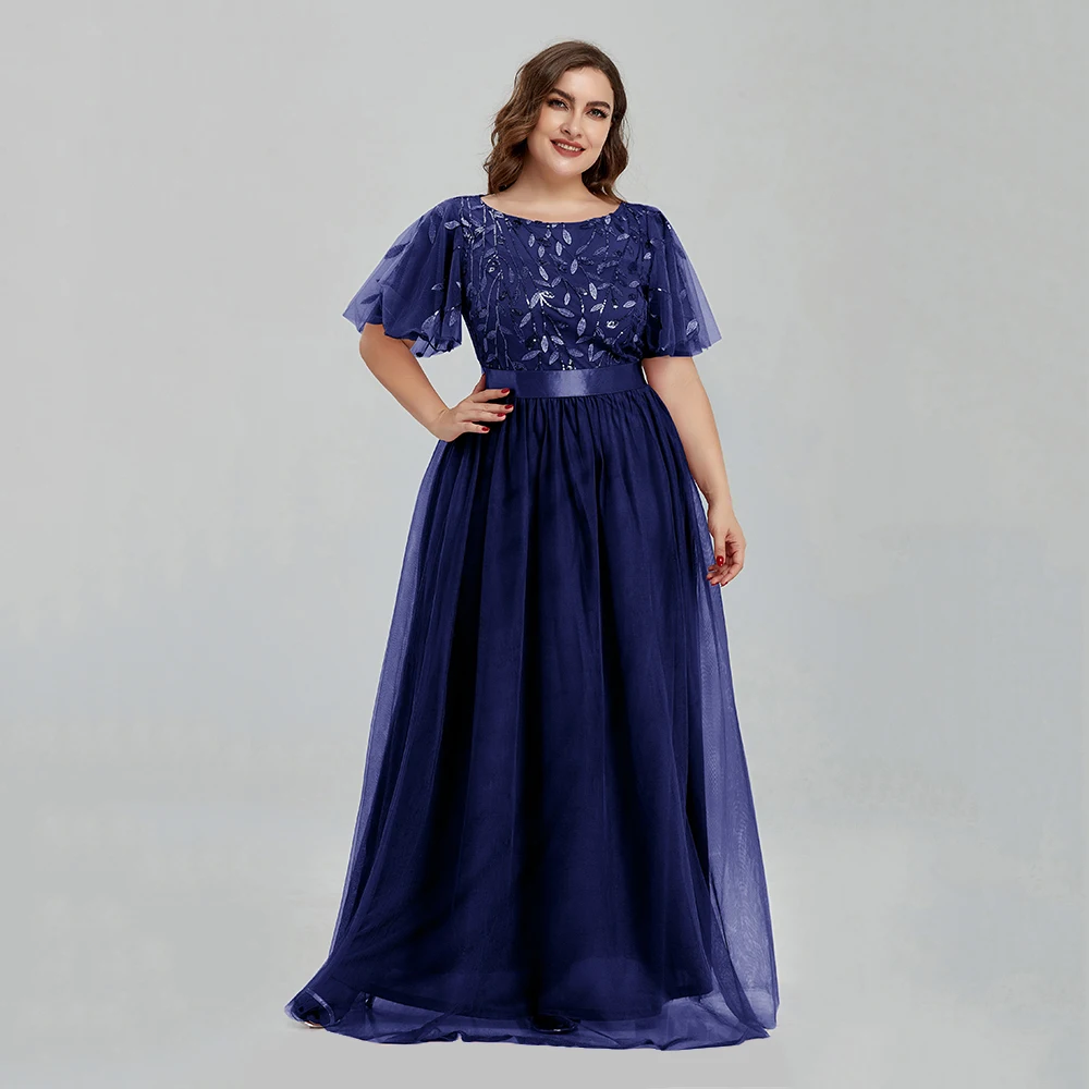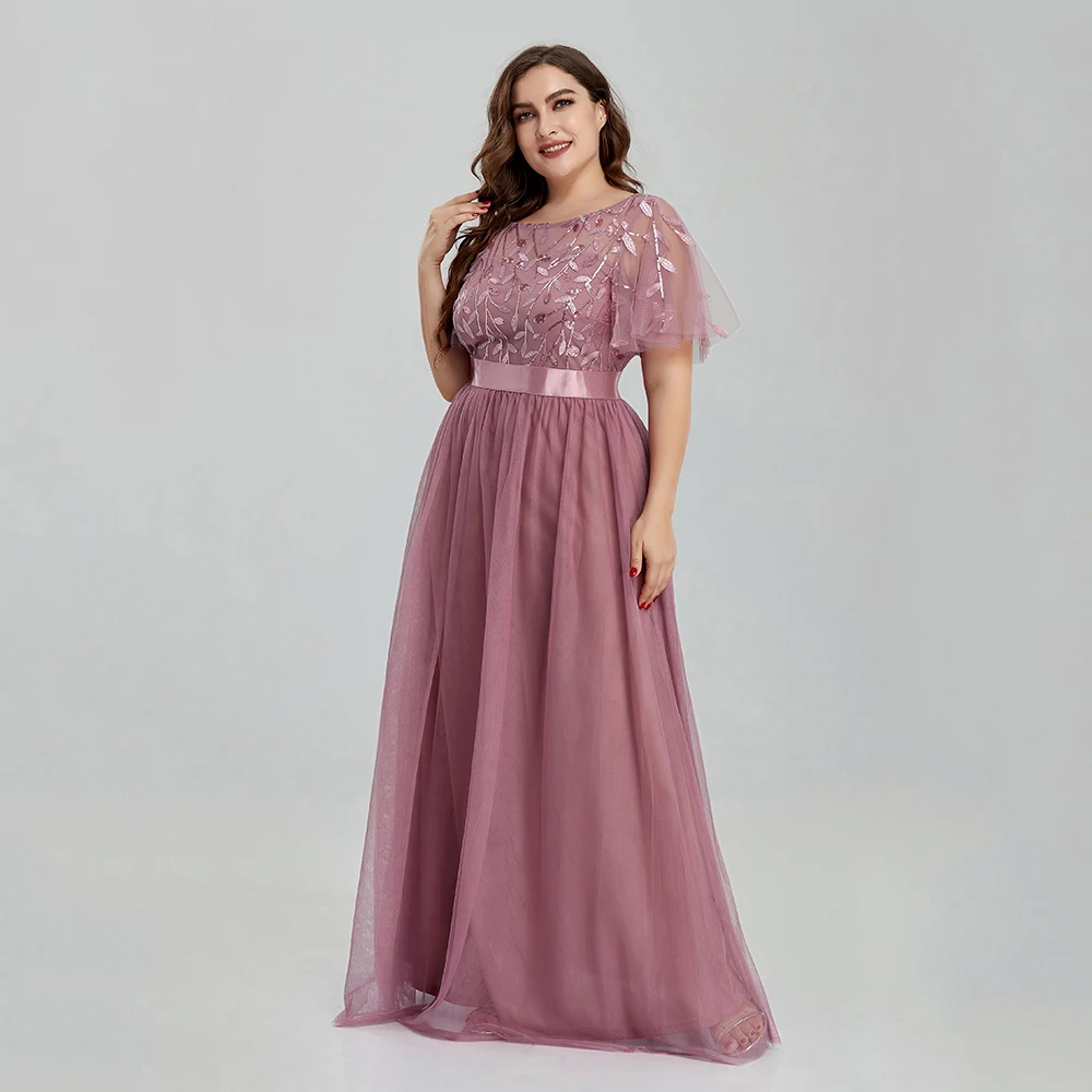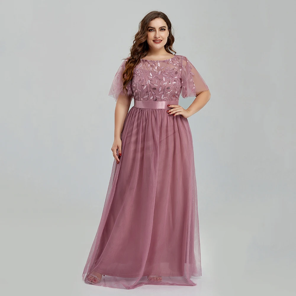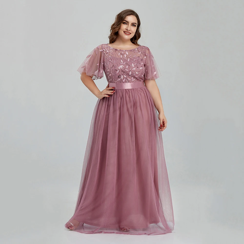 Women’s Plus Size Mesh A-Line Sequin Embroidery Evening Dress Leaf Maxi Prom Dress With Sleeves For Wedding Dress 2022