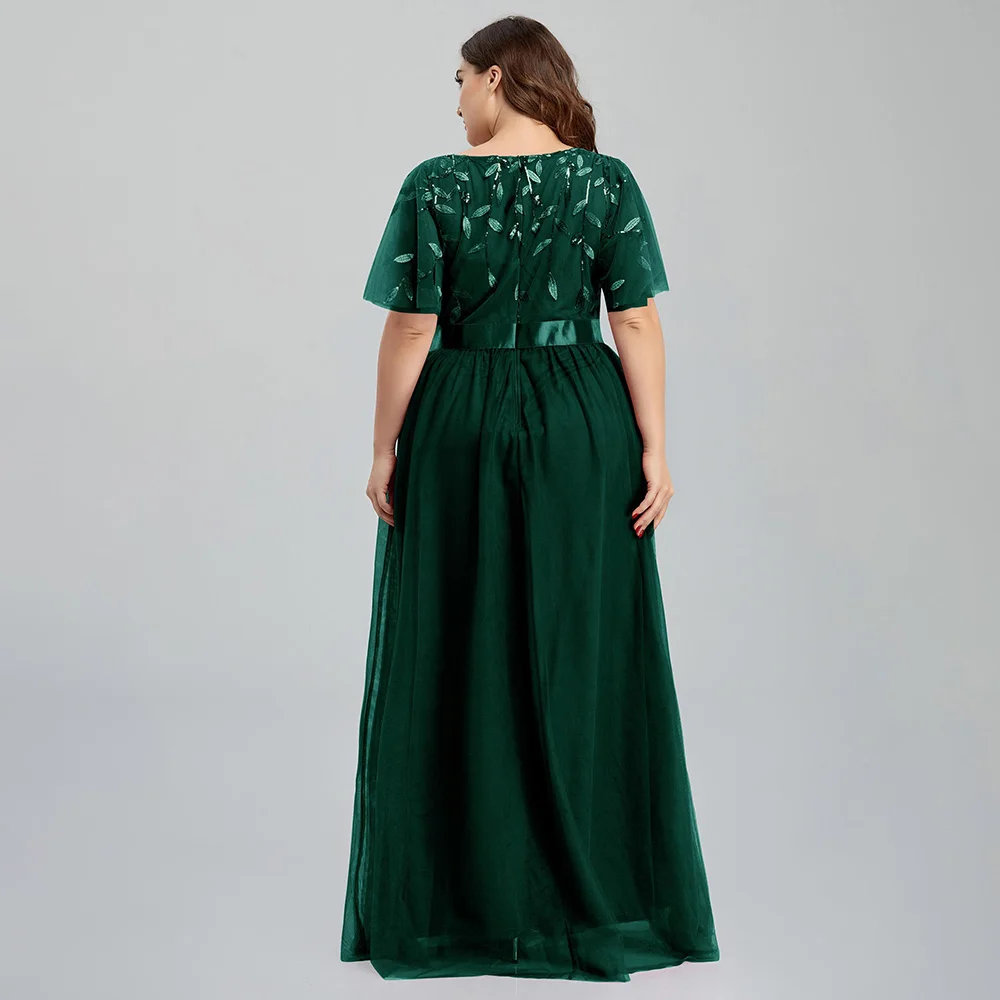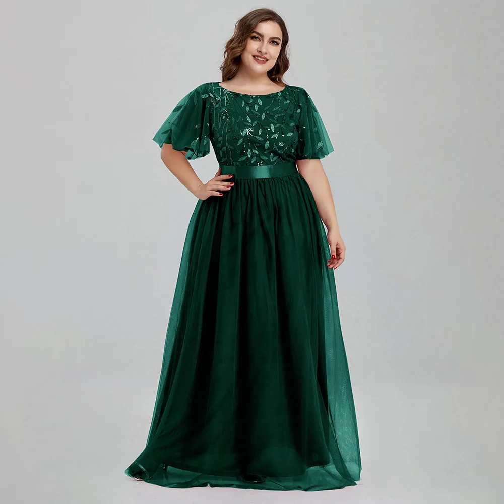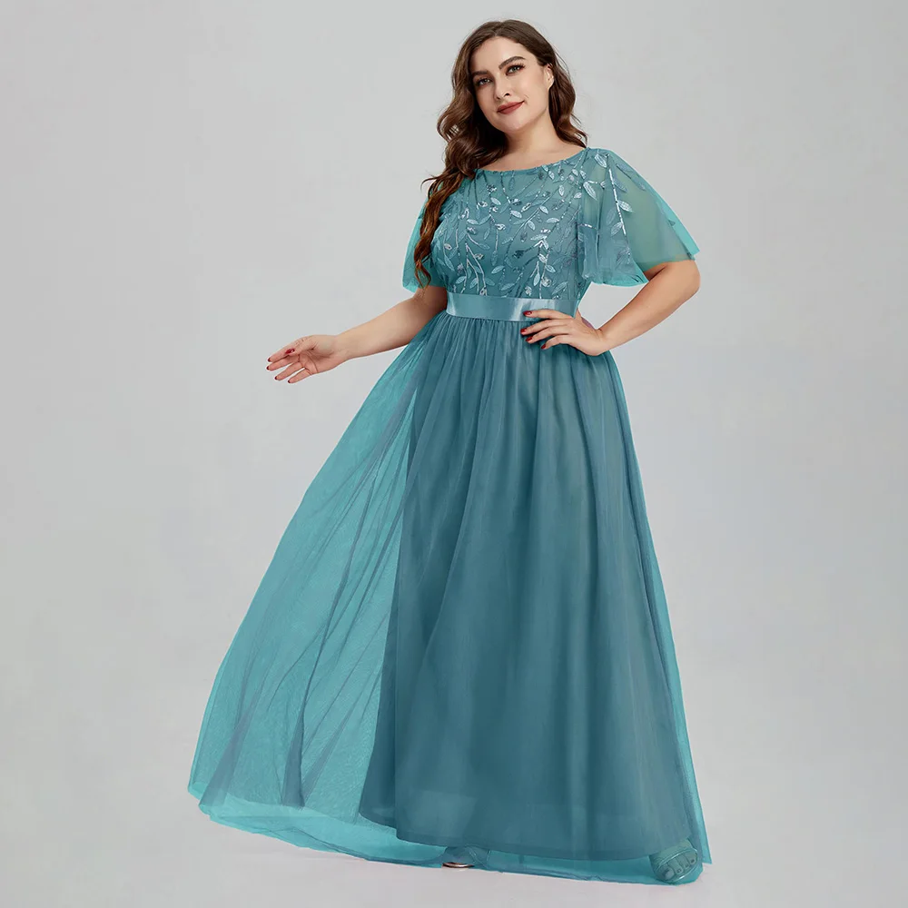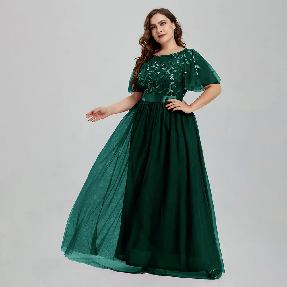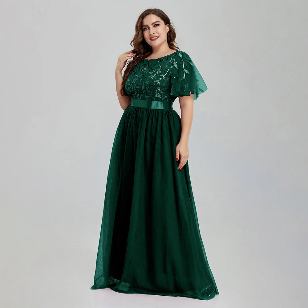 Women’s Plus Size Mesh A-Line Sequin Embroidery Evening Dress Leaf Maxi Prom Dress With Sleeves For Wedding Dress 2022