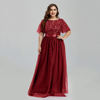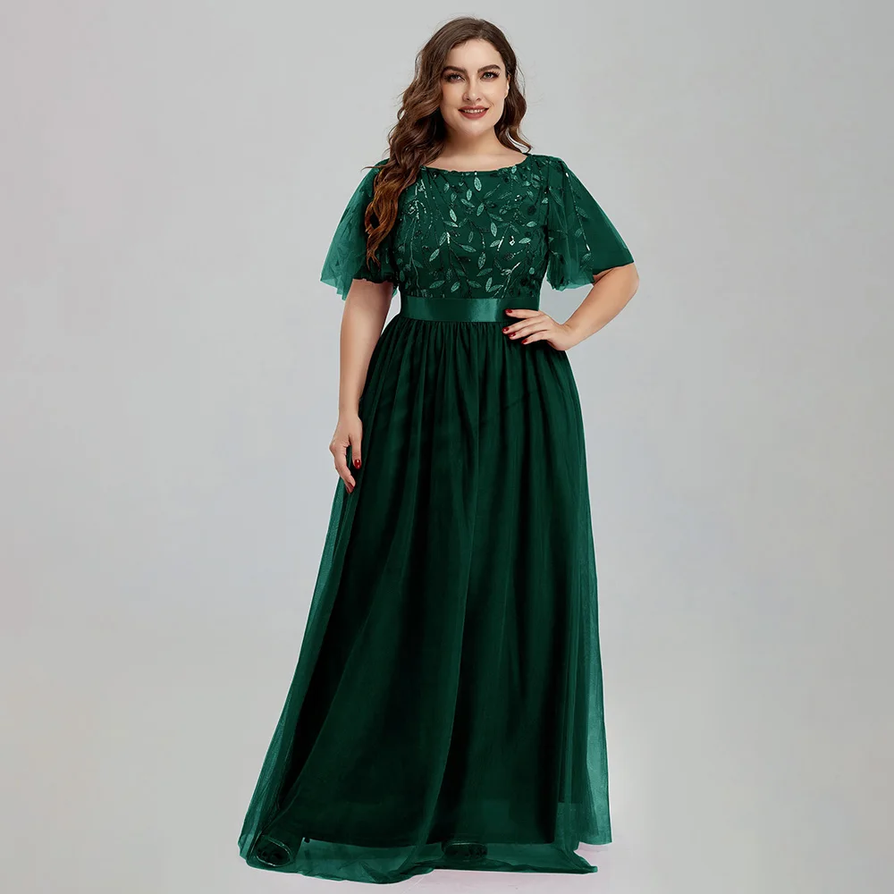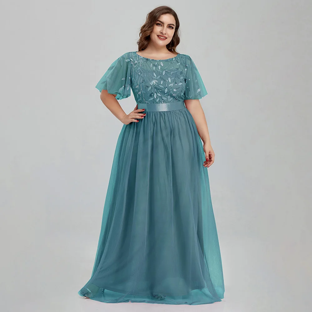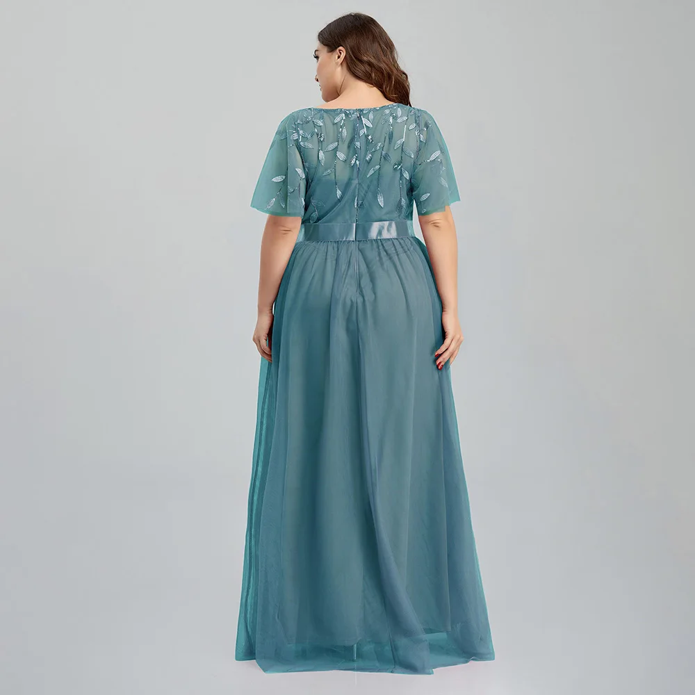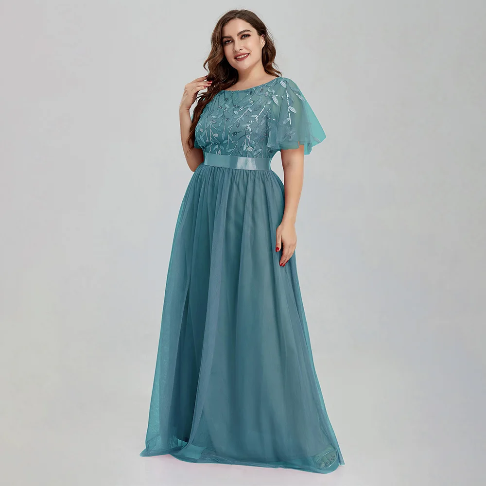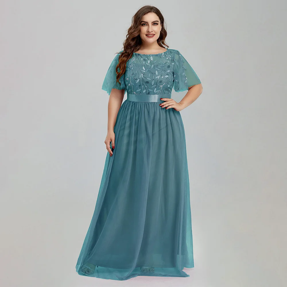 Women’s Plus Size Mesh A-Line Sequin Embroidery Evening Dress Leaf Maxi Prom Dress With Sleeves For Wedding Dress 2022