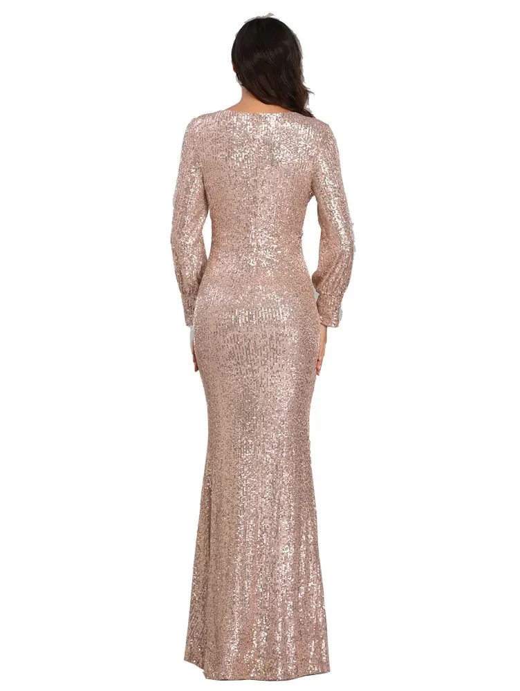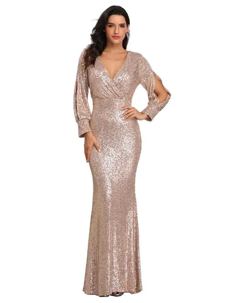 Women’s V Neck Long Sleeve Sparkling Sequins Mermaid Evening Sleeve Ball Gown Mermaid Skirt For Date Formal Wear Women Elegant